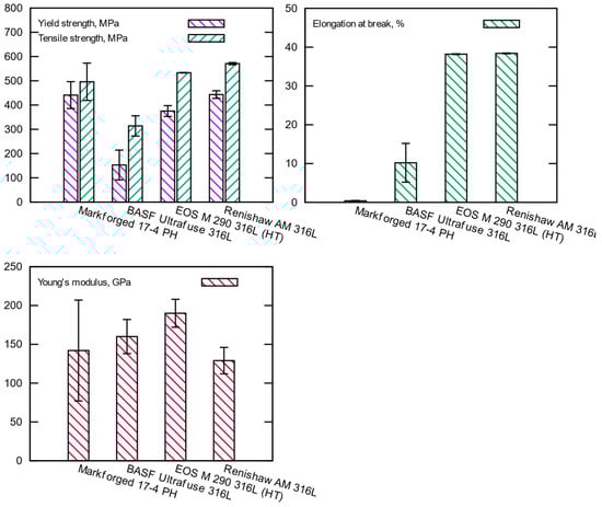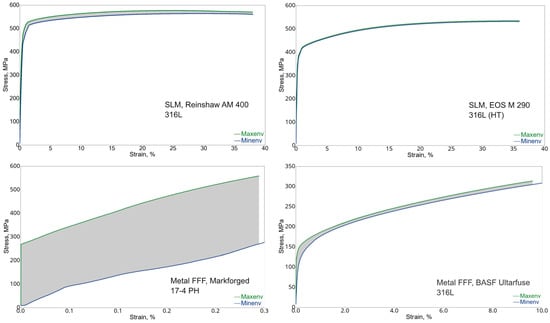 The tensile test results are summarized in Table 5 and Figure 5, and the envelope stress–strain diagrams are shown in Figure 6. The metal FFF specimens do not achieve the strength values specified by the filament manufacturers shown in Table 6. However, it should be emphasized that for the case of 17-4 PH stainless steel, Markforged published data only in (XY) build orientation, the most favorable one in the context of the strength.