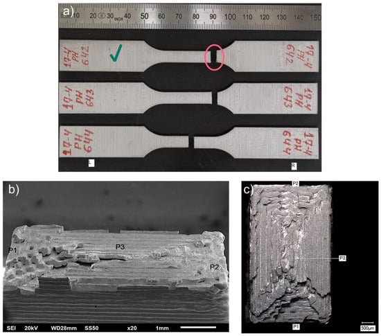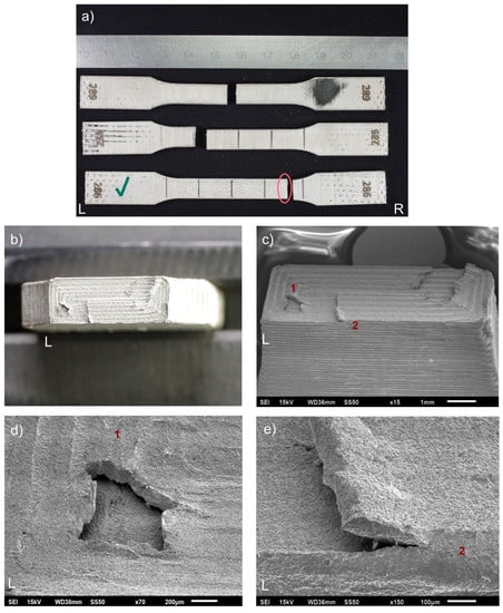 Fractures of tensile test 17-4 PH specimens presented as: (a) fractured specimens; (b) fracture surface, left side (optical microscope image), specimen 286; (c) fracture surface, left side (SEM image), specimen 286; (d) local delamination of a printed layer in the fracture, feature 1 (SEM image), specimen 286; (e) local delamination of the printed layer, feature 2 (SEM image), specimen 286. The samples have been numbered, which are visible in the figure. The letters L and R stand for the left-hand and right-hand sides of the sample in the figure. A green check mark means the specimen whose fracture faces were shown.