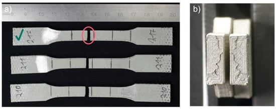 The yield strength and elongation at break values show considerable standard deviations, but the spread of the measured material characteristics is much smaller than for 17-4 PH specimens. The specimen fractures were typical for brittle material with a tiny necking portion. Interestingly, the fracture mechanism was the same as for 17-4 PH steel, namely, delamination of the printed layer, as shown in Figure 8. However, the phenomenon’s intensity is less visible than for the 17-4 PH specimens.