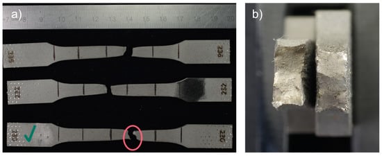 Fractures of tensile test BASF Ultrafuse 316L specimens presented as: (a) fractured specimens; (b) optical microscope image of the fracture surfaces, specimen 217. The samples have been numbered, which are visible in the figure. The letters L and R stand for the left-hand and right-hand sides of the sample in the figure. A green check mark means the specimen whose fracture faces were shown.