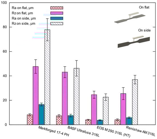 Table 7 and Figure 10 illustrate the results of a measurement of the surface roughness of the fatigue specimens. Two measurements were made on a flat and a side along the sample. The measurements were in the center of the specimens. As shown in the table, the results indicate that the metal FFF samples exhibit higher roughness values than their SLM counterparts in both measurement locations. For the flat orientation, the SLM 316L samples had approximately a mean Ra roughness of 4.1 µm, the BASF Ultrafuse 316L samples reached a mean Ra of 7.3 µm, and the Markforged 17-4 PH batch had a mean Ra of 8.2 µm. For the side orientation, the SLM 316L samples had a mean Ra of 4.8 µm, while the BASF Ultrafuse batch had a mean Ra of 7.5 µm, and the Markforged 17-4 PH specimens were as high as a mean Ra of 16.6 µm. The high Rz values of the FFF metal samples indicate that high surface profile extremes characterized their surfaces.