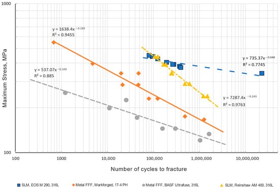 S-N curves for tested specimens; cycling tensile test with R = 0.1. (Two specimens of Ultrafuse 316L were broken in the grips, and their results were excluded.).