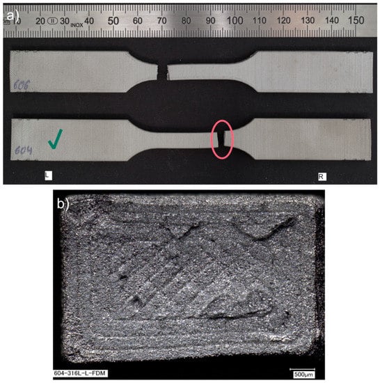 Returning to the relationship between the curves in Figure 6, it is evident that the 17-4 PH samples show a very large scatter in the stress–strain curves. In view of the observed broken samples, it must be considered that we are dealing with the existence of partially incompletely sintered material layers. That effect can also be seen for BASF Ultrafuse specimens, but the level of the gaps between the layers is much smaller.