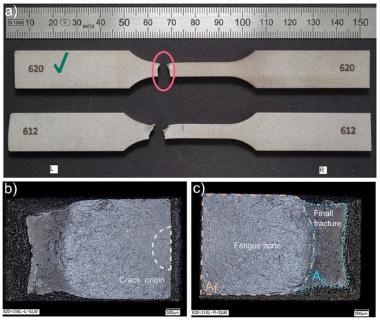 Fatigue fractures of Renishaw EOS M 290 316L samples: (a) fractured EOS M 290 316L specimens during the fatigue tests; (b) fracture surface (SEM image), left side, specimen 631, at 392,641 cycles; (c) fracture surface (SEM image), right side, specimen 631, at 392,641 cycles. The samples have been numbered, which are visible in the figure. The letters L and R stand for the left-hand and right-hand sides of the sample in the figure. A green check mark means the specimen whose fracture faces were shown.