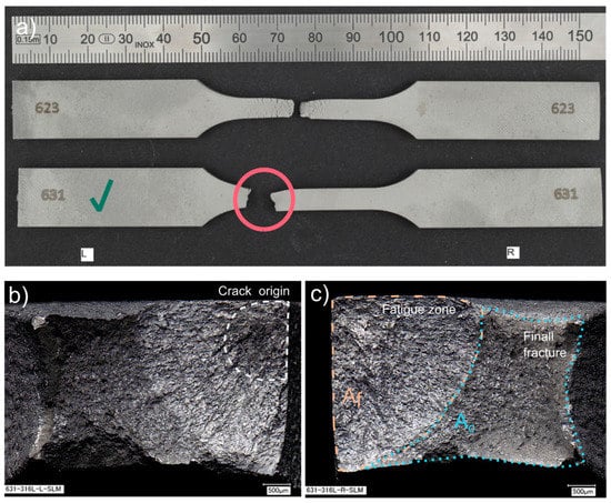 Turning to the experimental evidence on the SLM fatigue specimens (Figure 14 and Figure 15), the fatigue fractures are not flat looking at them macroscopically. They have a flat portion perpendicular to the applied stress and the other part with a very expressive necking. The flat parts originated during fatigue cycles–fatigue zone Af, and the other part Ac is the remaining material fractured catastrophically (final fracture). The ratio between those areas depends on the applied stress level. If the ratio, it is a case of the fracture in the low cycle fatigue regime, whereas when the ratio, is the fracture in a high cycle fatigue regime [25]. As seen in the Renishaw AM400 specimen, the ratio corresponds to 1,492,546 cycles, whereas for the EOS M 290 specimen, the ratio is 1.13, corresponding to 392,641 cycles.