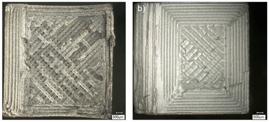 The metal FFF specimens of both steel types failed to generate an unmeasurable impact resistance; hence, no results can be reported. The fractures were confined to the printing plane, indicating poor inter-layer bonding. Some portions of the adjacent layer (printing lines) experienced sufficient cohesive strength to be not detached from their original layer. No apparent plastic deformation of the cross-section is visible. One can see a distinct printing pattern on fracture surfaces (Figure 16).