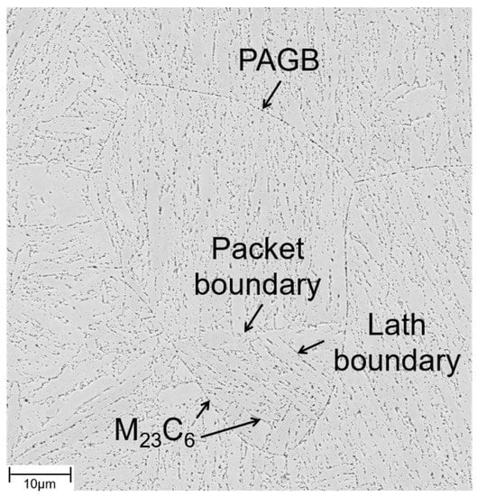 Ferritic-martensitic T/P 92 is a 9Cr-1Mo steel, which was developed to achieve higher permissible creep stress than T/P 91 []. For this purpose, T/P 92—in comparison to T/P 91—features a decreased Mo content of 0.5% and an addition of 1.8% of W []. The typical microstructure of a normalized and tempered martensite, consisting of prior austenite grain boundaries (PAGBs), packet and lath boundaries is depicted in Figure 1 []. Solid solution (Cr, W, V, Nb), precipitation (MX (M: V, Nb; X: N and M23C6 (M: Mo, Cr)) and sub-grain strengthening are employed in 9Cr-1Mo steels. However, during long-term creep, secondary, intermetallic Laves and Z-phase [] precipitates appear. The M23C6 particle size is usually much smaller in the grain interiors than at the PAGBs []. Moreover, the size of M23C6 particles is much larger than the size of MX carbonitrides []. Typically the MX carbonitrides are predominantly distributed within the lath matrix, while M23C6 precipitates primarily along PAGBs and packet, block and lath boundaries (Figure 1) [].