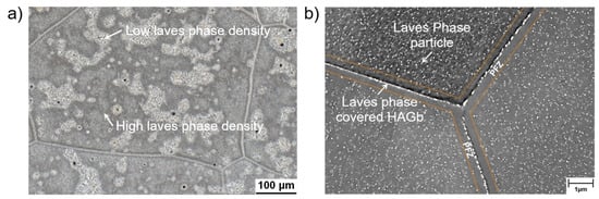 Characteristic microstructure of recrystallized and precipitation-annealed (RX + PA) fully ferritic Crofer®22 H steel. (a) Light optical resolution: Inhomogeneous Laves phase precipitate density (light areas: low density; dark areas: high density), caused by primary Ti/Nb-MX precipitates (reproduced from []). (b) SEM resolution: Particle-free zones (PFZ) located at high-angle grain boundaries (HAGB, reproduced from []).