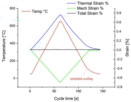 Schematic representation of an out-of-phase thermomechanical fatigue cycle with full (100%, i.e., εmechanical = −εthermal) obstruction of thermal expansion (ΔT = 50–650 °C, dT/dt = 10 K/s).