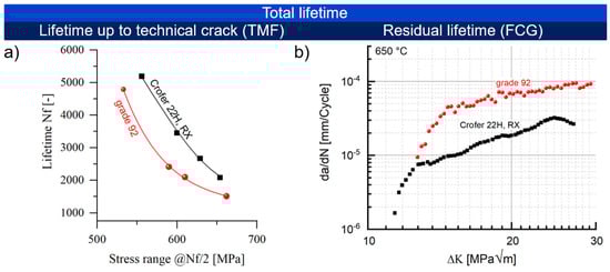 Total lifetime consisting of (a) the technical lifetime to cracking (characterized by (out of phase)-TMF lifetime (εmech = −εth., ΔT = 50−650 °C, dT/dt = 10 Ks−1, th = 0 at Tmin and Tmax []) and (b) residual lifetime (characterized by the crack propagation rate; 650 °C, R = 0.1 f = 20 Hz) of Crofer® 22H, RX and grade 92 [].