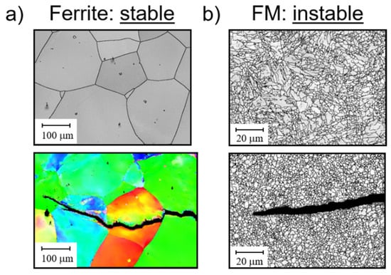 Comparison of grain structure in the initial state and in the vicinity of cracks induced by TMF loading in (a) a microstructurally stable ferritic (EBSD-image) and (b) an unstable ferritic-martensitic P91 [] steel (SEM image).