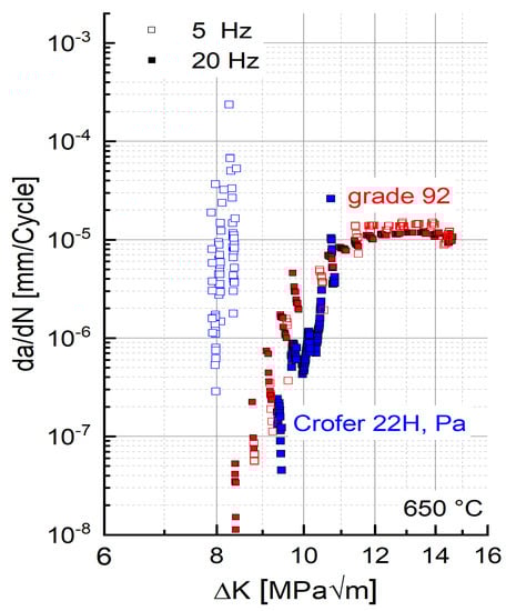 Besides the stable crack growth region, the threshold behavior is of considerable importance for the evaluation of the residual lifetime. Figure 6 shows the results of the threshold experiments carried out with precipitation-annealed Crofer® 22H (PA) in comparison to grade 92 steel at 5 and 20 Hz at 650 °C. In 9–12 Cr steels, an increase in threshold with decreasing frequency was observed [,]. The same was encountered with the grade 92 material in this study. In contrast, the threshold value of Crofer® 22H (PA) increased with increasing frequency, resulting in a drawback of 0.8 MPa√m at 5 Hz, but an advantage of 1 MPa√m at 20 Hz (cf. Table 3) over grade 92. A possible explanation for this “inverse” dependency would be pronounced plasticization at increased frequency (20 Hz). At high frequency, dislocations have less time to overcome obstacles; additionally, more precipitates form because of stronger plasticization [,]. Therefore, it is likely that in the 20 Hz experiment, the crack front did not completely pass through the plastic zone in front of the crack tip because of strong plasticization and increased precipitation, leading to an overestimation of the threshold.
