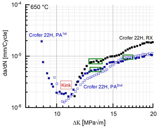 FCG data of Crofer® 22H in the RX and the PA state (f = 20 Hz, T: 650 °C).