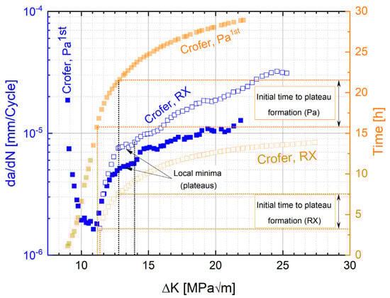 This “kink” (i.e., the range of decreasing crack propagation rate) accounts for about half of the cycles to failure (~1 million cycles). After the curve minimum, plateaus of approximately constant crack growth rate with increasing ΔK were encountered (highlighted by a green box in Figure 7) in the crack propagation curve. Both the kinks (exemplified in Figure 7) and the plateaus in cracking velocity were repeatedly observed in precipitation-annealed Crofer® 22H (PA), too. Figure 8 shows local minima (plateaus) in both the RX and PA states in da/dN vs. ΔK and ΔK vs. time plots. In order to enable direct comparison of the PA and RX states, the time in the PA state was corrected by adding a heat treatment duration of 1 h (at 650 °C) to the experimental time. In the RX state, it took about 4.4 h to initiate plateau formation (“initial” range, Figure 8), while it took about 5.9 h in the PA state (“initial” range measured from the global minimum (kink) in the PA state, Figure 8). The global minimum was chosen as the starting point for the initial range in the PA state, because from this point onwards, stress intensities, comparable to the RX state (shown in Figure 8 by dotted lines intersecting the x-axis), occurred. The stress intensity increases significantly faster with time in the RX than in the PA state. This indicates that under thermomechanical loading (I) Laves phase precipitation was accelerated [,] when starting from the RX state, and (II) additional Laves phase precipitation occurred after a prolonged (+1.5 h) incubation time when starting from the precipitation-annealed state. This implies certain reserves against crack propagation even in the PA state (rising branch, Figure 7), which is underlined by the fact that in both states, the number of bearable cycles ranges up to about 1 million.
