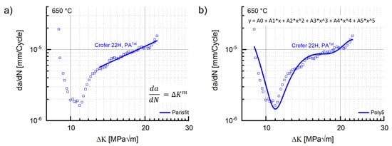 (a) Paris and (b) fifth-degree polynomial fit to the crack growth curves of precipitation-annealed Crofer® 22H (PA) (f: 20 Hz, T: 650).