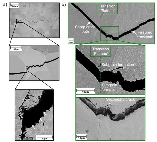 To identify the mechanisms responsible for such unconventional cyclic crack growth curves, the microstructures were investigated in the initial state and after termination of experiments in “plateau” regions (Figure 7). In kink range (where cracking velocity decreased despite increasing ΔK), the formation of sub-grains was observed (Figure 10a). Sub-grain formation also occurred in the range of higher stress intensities (where cracking velocity increased with increasing ΔK), but led to plateau formation (Figure 10b). In this region, the crack path appeared cascade-like with fissured edges, while a straight crack path with sleek edges was observed before the transition into the “plateau” area. This implies crack deflection at sub-grain boundaries (SGBs) to be the root cause for the cascaded crack path and the fissured crack edges. Moreover, secondary cracks grew along SGBs.
