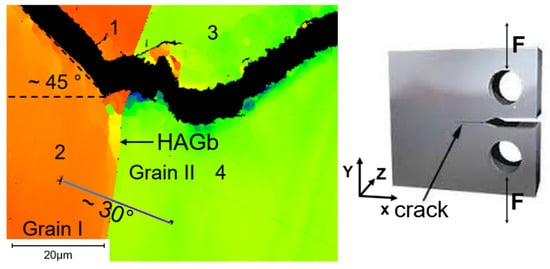Sub-grain formation initiated in front of the high-angle grain boundary (HAGb) and then continued into the adjacent grain (Figure 11). To analyse the causes of sub-grain formation, Schmid factors of the slip systems parallel to the applied force and the misorientation of the two neighbouring grains were determined. In the following discussion, a low number of screw dislocations was assumed, otherwise Schmid’s law would not be applicable. The crack in grain I propagated at an angle of 45° to the tensile load, i.e., along the path of highest shear stress. This was consistent with the determined Schmid factors of ~0.5 near the crack path. Furthermore, all slip systems in grain I were activated earlier, because of the higher Schmid factors evaluated (cf. Table 5). Consequently, shear stress acted on the slip systems. In addition, the matching Schmid factors of the () and ) systems demonstrate that double slip had occurred. In grain II, the crack growth direction changed (Figure 11) near the grain boundary. The misorientation angle between grain I and II was measured to about 30°. According to the lower Schmid factors (cf. Table 5), the slip systems in grain II were activated later. During deformation, dislocations accumulate at grain boundaries. If a critical dislocation density is then reached, the total energy may be lowered by the rearrangement of dislocations into groups. Mutual reduction of the strain field of each dislocation in this case results in lowered total stored energy []. This indicates that certain orientation relationships favour sub-grain formation.