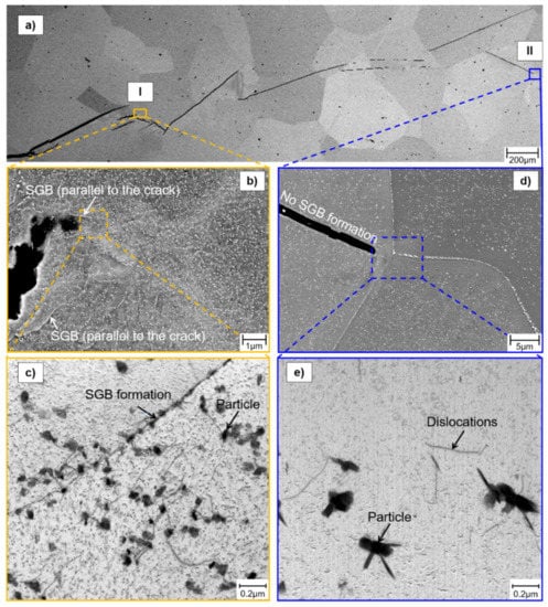 with denoting dislocation density, d sub-grain size and K a material constant. This could indicate varying dislocation densities, caused by different loading conditions (e.g., testing frequencies), influencing the resulting sub-grain size and thus the local strengthening by grain refinement in front of the crack tip. For example, higher testing frequency could cause higher dislocation density and consequently smaller sub-grain size. Furthermore, the crack was deflected at sub-grain boundaries and at Laves phase particles (Figure 13), resulting in a prolongation of the crack path and consequently increased residual lifetime.
