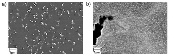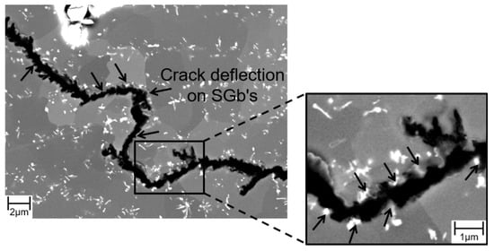 Even in the precipitation-annealed state, thermomechanically triggered precipitation of additional Laves phase particles (Figure 14) occurs at sufficient plastic deformation in Crofer® 22H. These newly formed precipitates additionally obstruct crack growth. Compared to thermal loading only (Figure 14a), a significantly higher particle density was encountered under thermomechanical loading (Figure 14b). In addition, newly formed SGBs are rapidly covered by nucleating precipitates and act as further obstacles for dislocation movement and crack propagation.