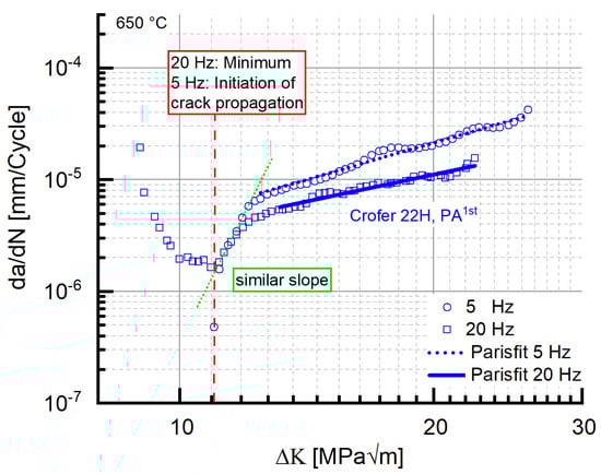 Reduced testing frequency (from 20 Hz to 5 Hz) caused the crack propagation rate of precipitation-annealed (PA) Crofer® 22H to increase (Figure 15, cf. coefficient C and exponent m in Table 6), which is a well-known behavior of steels [,]. At 5 Hz, the initial kink was absent. The working hypothesis to explain this behavior encompassed a combination of diminished strain hardening potential and more time for dislocations to overcome obstacles (e.g., Laves phase particles) at low frequency. However, at low frequency (5 Hz), higher stress intensity was required to initiate crack propagation (ΔKStart, 5Hz, air~11 MPa√m vs. ΔKStart, 20Hz, air ~9 MPa√m; a detailed description of the determination of ΔKStart is given in []). Furthermore, the ΔKStart value of the 5 Hz experiment coincided with the ΔK value at the minimum of the 20 Hz experiment. In addition, the curve slope of the 5 Hz experiment after the kink (Figure 15) was comparable to the one encountered initially in the 20 Hz experiment.