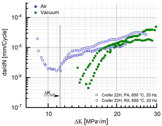 Interestingly, the same absence of the initial drop of da/dN with rising ΔK along with the coinciding ΔKStart value of 11 MPa√m was observed in recrystallized Crofer® 22H (RX) at 20 Hz (Figure 7), too. This may indicate that the root cause of the absence of the initial drop is not testing frequency. Rather, a limit value stress intensity ΔKLV (to avoid confusion with the threshold value ΔKth.) may exist, from which the outlined strengthening mechanisms (i.e., thermomechanically induced precipitation and sub-grain formation, crack defection at sub-grain boundaries) cannot longer overweigh the increasing stress intensity. To verify the assumption further, 20 Hz FCG experiments were carried out at the same load ratio with recrystallized and precipitation-annealed material in vacuum. Vacuum was chosen as the testing environment to eliminate corrosive mechanisms and thus achieve higher ΔKStart values at comparable load ratios.