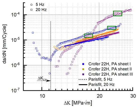 - No “classical” Paris regime occurred in Crofer® 22H, PA at 20 Hz.