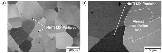The second steel investigated in the presented work was Crofer® 22H. The formation of a duplex Cr2O3/(Mn,Cr)3O4 surface oxide scale results in excellent oxidation resistance [] at high temperature. In contrast to the 9Cr-1Mo steels, fully ferritic, high chromium stainless steels such as Crofer® 22H cannot be strengthened by carbide and nitride precipitation because of the limited solubility of C and N in the ferrite matrix. For this reason, Crofer® 22H is strengthened by a combination of solid solution and intermetallic (Fe,Si,Cr)2(Nb,W) Laves phase precipitate hardening []. Nb is a strong carbonitride former. To make the best use of Laves phase precipitation, the C and N contents have to be kept to a minimum (<0.01 wt. %). Even low levels are sufficient to consume Nb by formation of primary Nb/Ti-MX (with X = C, N []) and by this, significantly reduce the amount of Nb available for precipitation of fine Laves phase [,,,] precipitates in the surrounding alloy matrix (Figure 2a, reproduced from []). In this type of Laves phase strengthened steel, TMF [,,] and long crack growth behaviour [] are significantly impacted by additional, thermomechanically induced precipitation of Laves phase particles. The characteristic microstructural features of recrystallised and precipitation-annealed (RX + PA: 1075 °C/22 min/air cooling + 650 °C/2 h/water quenching) Crofer® 22H are fine, evenly distributed (except in the neighbourhoods of primary MX-particles) intragranular Laves phase particles and Laves phase-covered high-angle grain boundaries (HAGBs) with adjacent particle-free zones (PFZ, Figure 2b).