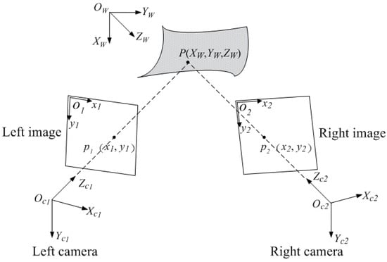 To implement the stereo-DIC measurement, the camera calibration is an essential step for determining the correspondence between the 3D space point and the two-dimensional (2D) image points. The basic principle of binocular stereo-vision [3,4] is presented in Figure 2. is a 3D physical point on the measured surface, and represent its stereo projections in the images of left and right cameras. By triangulation, the 3D coordinates of the physical point P in the world coordinate frame can be recovered from the two image points and according to the following equation: