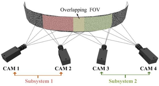 The first form of camera arrangement is presented in Figure 6. Two cameras composed of one set of stereo-DIC subsystem and multiple sets of stereo-DIC subsystem are arranged parallel to or circumferentially around the object to measure the local portions of entire surface. A certain overlapping FOV between adjacent stereo-DIC subsystems is required to guarantee the continuous deformation measurement.