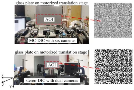 To assess the measurement uncertainty of MC-DIC, a rigid motion test is conducted. As depicted in Figure 4, a glass plate is fixed on the high-precision motorized translation stage, which can provide movement in a certain direction. One side of the plate is monitored by a continuous-view MC-DIC system with six cameras, and the other side is a conventional stereo-DIC system with dual cameras. A known rigid motion of the plate is given by the translation stage, being simultaneously measured by the two systems. Both systems are composed of the same industrial cameras GRAS-50S5M-C (Point Grey Research Inc., Richmond, BC, Canada) with resolution of 2448 × 2048 pixels and pixel size of 3.45 μm and the same Kowa lenses with focal length of 25 mm. The measuring Area of Interest (AOI) of two systems is both 400 mm × 160 mm. To avoid the influence of different speckle sizes, speckles with suitable sizes are generated by the computer according to the FOV difference of single camera in the two systems, and then pasted on both sides of the plate after printing.
