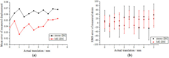 The plate is continuously translated 10 times with the speckle images being captured. The translation quantity of two adjacent images is 0.5 mm, and the maximum translation displacement is 5 mm. Figure 5a presents the mean errors of the measured displacements by two systems. MC-DIC is capable of improving the displacement measurement accuracy to some extent. Furthermore, given that the strain field of rigid body motion is theoretically equal to zero, the measured strain represents the measurement error. It can be seen from Figure 5b that the root-mean-square (RMS) error of strain measured by MC-DIC is within ±60 με, and that by stereo-DIC is within ±95 με. The strain measurement accuracy of the MC-DIC system is also improved compared to the stereo-DIC system.