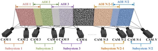 Take the parallel arrangement for elongated planar surface as an example, each set of subsystem observes the corresponding AOI, and a certain AOI overlap exists between the neighboring subsystems. Specifically, cameras 1 and 2 constitute subsystem 1 for measuring AOI 1, cameras 3 and 4 constitute subsystem 2 for measuring AOI 2, and cameras 5 and 6 constitute subsystem 3 for measuring AOI 3. There is a partial overlap between AOI 1 and AOI 2, as well as that between AOI 2 and AOI 3. The intermediate cameras are also arranged in the same manner. The penultimate subsystem N/2-1 composed of cameras N-3 and N-2 measures AOI N/2-1, the last subsystem N/2 composed of cameras N-1 and N measures AOI N/2, and AOI N/2-1 and AOI N/2 has certain overlap. In addition, for object with large curvature, especially the cylinder, multiple sets of stereo-DIC subsystem are arranged circumferentially around the object. The camera arrangement in Figure 4 can also be adopted with minor adjustment, namely, the last subsystem N/2 must have a partial AOI overlap with the first subsystem 1, so as to guarantee the continuous full-circle measurement of cylinder.