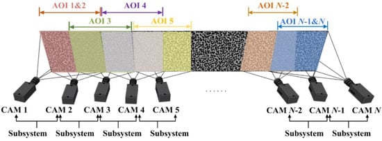 Similarly, the parallel arrangement for object with large slenderness ratio is illustrated for instance. The AOIs of cameras 1 and 2 are completely coincident, forming a stereo-DIC subsystem to measure AOI 1&2. The same goes for the two cameras at the end, the AOIs of cameras N-1 and N exhibit a complete overlap to constitute a stereo-DIC subsystem for measuring AOI N-1& N. For cameras in the middle, the AOIs of adjacent cameras overlap by more than half, and subsystems are composed of every two neighboring cameras.