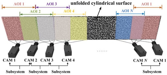 Moreover, for object with large curvature, especially the cylinder, we can utilize the revised edition of the second arrangement, as shown in Figure 8, to place cameras circumferentially around the object. The two cameras at each end do not need complete overlapping AOI, but camera 1 and camera N should be linked together with an AOI overlap more than half. To achieve continuous full-circle measurement of cylinder, the AOIs of every two neighboring cameras overlap by more than half, especially camera 1 and camera N, and subsystems are composed of every two adjacent cameras having overlap AOI.