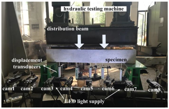 The cross-section size and length of example beam are 200 mm × 120 mm and 1350 mm, respectively. Random black-and-white speckles are produced by spray painting. The hydraulic testing machine is used for loading, and the four-point bending is realized with a distribution beam. A hybrid control loading strategy of load control first and then displacement control is adopted. Before the yielding of steel bar or BFRP bar, the loading level is set to 5 kN per stage, and after the bar has yielded, displacement control loading with the mid-span deflection difference of 0.5 mm is conducted until the specimen failure, so as to prevent the possible damage of measuring instruments caused by the concrete crushing and spalling. The experimental setup is shown in Figure 9, including eight industrial cameras (Point Grey GRAS-50S5M-C) with resolution of 2448 × 2048 pixels and pixel size of 3.45 μm, eight Kowa lenses with focal length of 25 mm, and LED light supplies.