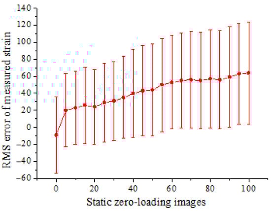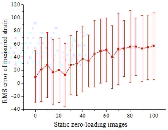 In order to quantify the noise or error, a series of static images are acquired from the undeformed specimen before loading. The RMS error of strain computed from the static zero-loading images is shown in Figure 10. The measured strain is within ±110 με, showing an overall slight increasing trend.