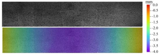 Through adjusting DIC calculation parameters both in noise analysis and actual experiment analysis, the parameter selection can be confirmed considering the balance between noise filtering and accuracy. The subset size is set to 35 × 35 pixels, the grid step size is set to 7 pixels, and the strain calculation window size is set to 15 × 15 calculation points. The full-surface speckle pattern and the 3D surface topography are presented in Figure 11. The figure indicates that the continuous-view MC-DIC system can completely restore the speckle image and 3D contour of the entire beam with large slenderness ratio.