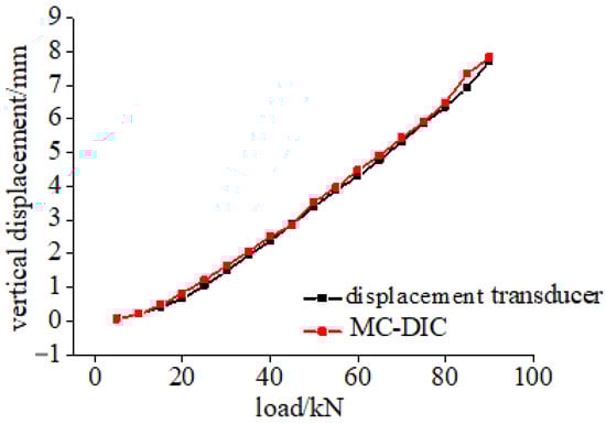 Take the bottom mid-span point as an example, the displacement calculation result of MC-DIC is compared with the measurement data of displacement transducer. Clearly observed from Figure 12, the two curves are basically consistent, and the relative error is within 3%. The main reason for this difference is that there is friction between the measuring rod and sleeve of displacement transducer, when the deformation is too small, the effective sliding of the measuring rod is difficult, resulting in a smaller value of the displacement transducer. It should also be noted that a certain deviation exists between the positions of DIC calculating point and actual measuring point of displacement transducer, due to the manual extraction of DIC data point.