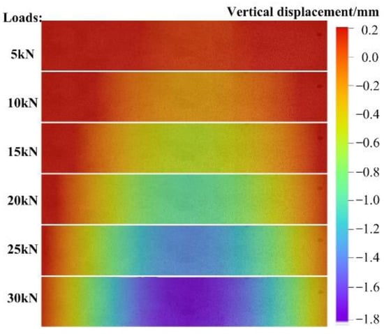 Figure 13 intuitively reveals the full-field displacement evolution in vertical direction. The displacement increases gradually with the increase of load, and the maximum displacement occurs at the mid-span position. This result is consistent with the deformation characteristics of the four-point bending beam. Moreover, the displacement field vividly shows the process of deformation gradually spreading from the mid-span to the supports.