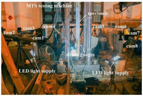 The section diameter and length of example column is 100 mm and 1800 mm, respectively. A thin coating of random, black-and-white speckle particles is sprayed on column surface to create the speckle pattern required for DIC. The axial compression experiment of circular column with hinged ends is conducted with the MTS testing machine. Displacement control loading is adopted with the loading speed of 0.3 mm/min. The experimental setup is shown in Figure 16, containing eight industrial cameras (Point Grey GRAS-50S5M-C) with resolution of 2448 × 2048 pixels and pixel size of 3.45 μm, eight Kowa lenses with focal length of 25 mm, and LED light supplies.
