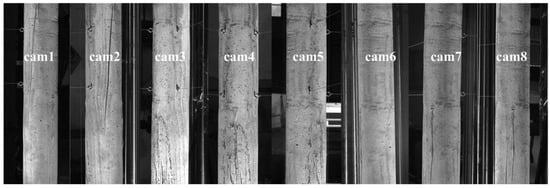 The system construction process is as follows: (1) Instead of measuring the whole column length, only the mid-span part with larger deformation is taken for DIC measurement, that is the area from 300 mm above the mid-span to 300 mm below the mid-span. Therefore, the FOV height of DIC is set to 700 mm. (2) After determining the relative distance between cameras and specimen according to the measurement range, eight cameras are circumferentially arranged around the column with FOV of about 700 mm × 700 mm for each camera. The FOVs of adjacent cameras overlap by more than half, especially, the FOVs of camera 1 and camera 8 also need to be overlapped more than half, so that the end-to-end closed loop can be achieved. (3) Eight cameras are mounted rigidly to the high-strength carbon fiber tube through connecting sleeves, and then the tubes are fixed on six tripods, forming an eight-camera MC-DIC system. In the experiment, the exposure time of each camera is fixed to 25 ms and the aperture of each lens is set to moderate. For the given aperture and exposure time, sufficient contrast is obtained while avoiding the reflection and limiting motion blur, by adjusting the LCE light supplies. Eight cameras are synchronously controlled to capture images with acquisition frame rate of 1 frame/s. The local region captured by each camera is presented in Figure 17. Simultaneously, strain gauges are installed for the comparison between optical and electrical measurements.