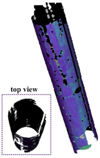For DIC calculation, the subset size is set to 29 × 29 pixels, the grid step size is set to 7 pixels, and the strain calculation window size is set to 15 × 15 calculation points. All the DIC parameters are selected considering the balance between smoothness and accuracy. As shown in Figure 19, MC-DIC is capable of fully reconstructing the 3D shape of the circular column. It should be pointed out that the missing parts on the following deformation fields are caused by the occlusion of strain gauges and connecting wires.