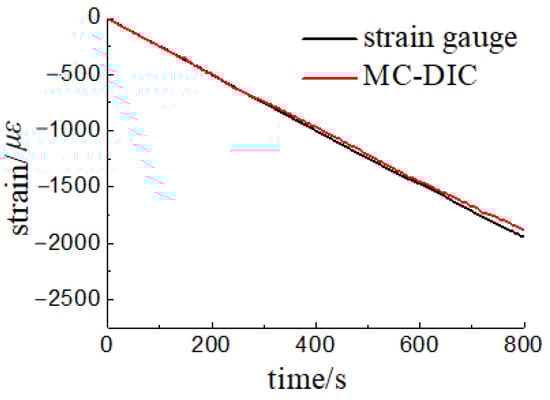 Similarly, we compare the strain gauge data with MC-DIC to verify the correctness of MC-DIC in strain measurement. It can be seen from Figure 20 that the data of strain gauge and MC-DIC are in good agreement with a maximum error of less than 3.8%. The difference between the two values tends to increase with the loading progress, which can be partially attributed to the fact that spray painting roughens the timber surface with loading time, resulting in a certain loss of accuracy in data extraction. This problem can be addressed by directly spraying black speckles on the specimen without a base coat of white paint or changing the speckle fabrication method, such as different transfer printing techniques, which deserves further experimental attempts.