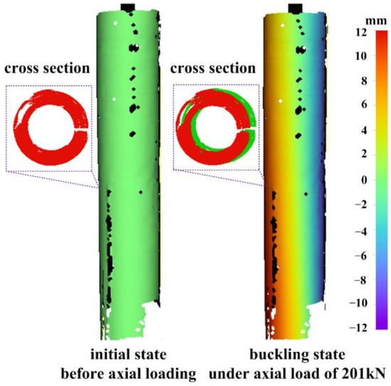 The lateral displacement field, reflecting the buckling direction, is depicted in Figure 21. From the perspective of cross section, green circle denotes the initial section, red circle represents the current section, and red circle is placed on top of green circle to reveal the lateral displacement. In the initial state before axial loading, the current section is exactly the initial section, so red and green circles overlap. In the buckling state under axial load of 201 kN, the current section (red) is offset compared to the initial section (green), indicating that a lateral displacement has occurred. Observed from the displacement field, there is a convex displacement on one side of the column (orange part to the left) and a concave displacement on the other side (blue part to the right).