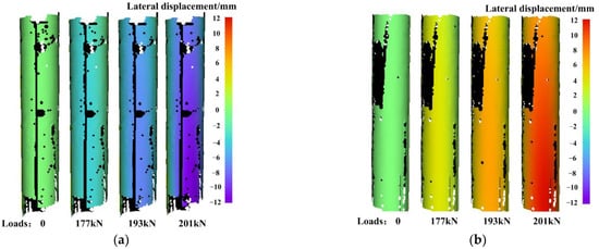 To more clearly illustrate the deformation evolution on entire 360° cylindrical surface, Figure 22a,b presents the displacement evolution on the concave and convex sides of the column under different axial loads, respectively. The uncalculated black parts on the deformation fields are caused by occlusion of strain gauges and connecting wires. As the loading progresses, the displacements on the concave and convex sides gradually increase from 0 to about 12 mm.