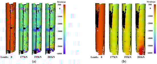 Correspondingly, MC-DIC can also obtain the full-circle strain field, the strain evolution on the concave and convex sides under different axial loads are shown in Figure 23a,b, respectively. First, the compressive strain on the column surface gradually increases with the loading. Secondly, the compressive strain around the column is not evenly distributed, the concave side undergoes a larger compressive strain than the convex side. The concave surface finally has a strain value up to about 5000 με, while the convex surface has a maximum strain value of around 2500 με. It should be noted that the data with larger errors at the lower end of the column are not taken into consideration. During the measurement, to avoid the speckles in AOI from being arbitrarily blocked, all the dangling wires of strain gauges are gathered together along a line (see in Figure 16 and Figure 17) and concentrated to the lower end. Besides, the speckle range is larger than the AOI to ensure enough valid data. Thus, the speckle spraying quality at the edges away from the mid-span is relatively poor. All above results in the local large-error area in the lower edge.