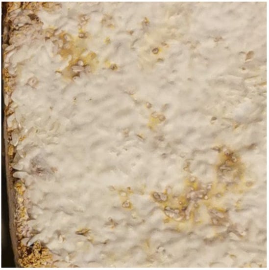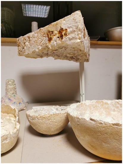 Mycelium-Based Composites (MBC) consist of defragmented lignocellulosic particles bonded with dense chitinous mycelium. These innovative biomaterials show eco-friendly characteristics: waste materials usage, low energy demand during production, the production does not generate waste, and the products are readily recycled [1]. The performance properties of MBC are usually inferior to those of the materials used so far. However, their advantages are revealed in some areas, such as high acoustic attenuation, fire resistance, the absence of harmful synthetic chemical components [2,3,4], and advantages connected with aesthetics. In turn, the drawbacks of MBC, which need to be eliminated, include excessive hygroscopicity, low tensile strength, susceptibility to biological corrosion, and the need to deactivate the fungus. Improving the properties of this innovative material is the goal of many scientific and commercial endeavors [5,6]. Thus, the potential applications of MBC may be found in architecture [7,8], packaging [9], the automotive industry [10], as a furniture material, in art [8], and in manufacturing various chitin- and β-glucan-based flexible materials, such as foams or paper, as well as textile substitutes [11]. The scientific literature describes the biocomposites as pure mycelium bio-materials, consisting only of mycelial biomass, e.g., myco-leather, as a substitute for petrochemically produced and animal-based leather [12]. There are also concepts for the use of mycelium to grow monolithic buildings from the functionalized fungal substrate [13] and as self-repairing wearable electronics, using various fungus properties (memristors, oscillators, pressure, and optical and chemical sensors) [14]. The results of our own feasibility studies on different surface structures of MBC required in art and architecture uses are shown in Figure 1, Figure 2, Figure 3, Figure 4 and Figure 5. In all cases, the Ganoderma lucidum was the binding agent, the substrates contained admixtures.