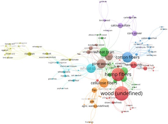 Substrates for the production of Mycelium-Based Composites originate from three sources: agricultural by-products, industrial waste, and post-consumer waste. In terms of their composition, these substrates can be divided into annual plants, softwood, and hardwood. Common bulk substrates include several components: wood chips or sawdust, mulched straws (wheat, rice, and others), chopped corncobs, recycled paper, nut and seed hulls or meal, coffee pulp or grounds, and brewer’s grain. An ideal substrate contains enough nitrogen and carbohydrates for rapid fungal mycelium growth. Various substrates are compared in scientific analyses or combined as mixtures in different proportions. Combinations of various substrates in scientific experiments, described in 85 scientific publications [21,23,24,25,26,27,28,29,30,31,32,33,34,35,36,37,38,40,41,42,45,46,49,50,51,52,53,57,58,59,60,61,62,63,64,65,66,67,68,70,72,73,74,75,76,77,78,79,80,81,82,83,84,86,87,88,89,90,91,92,93,94,95,96,97,98,99,100,101,102,103,104,105,106,107,108,109,111,112], are presented in Figure 8. The size of the circle shows the popularity of the substrate and the lines indicate the most frequently used comparisons of substrates in scientific publications.