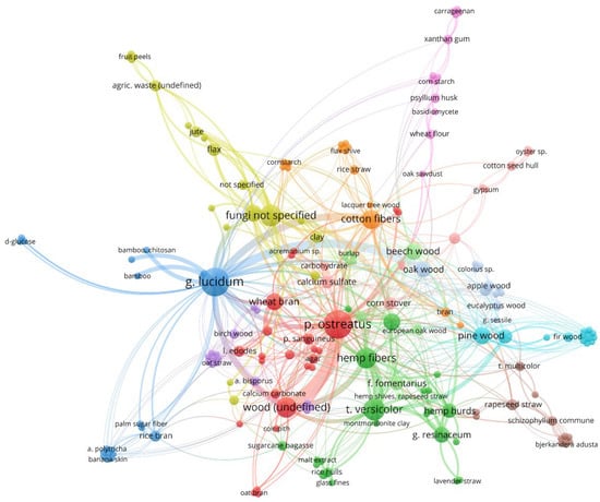 The substrate has to contain the nutrients required for fungus growth to improve the growth rate and modify mechanical strength properties, which the mycelium matrix attains after growth. Simple sugars, such as glucose, are used as additives. The addition of glucose to the lignocellulose material results in the lesser degradation of holocellulose at the preliminary stage of degradation caused by fungi. Figure 9 illustrates lignocellulose substrates linked with various fungus species in original articles related to Mycelium-based Composites [21,23,24,25,26,27,28,29,30,31,32,33,34,35,36,37,38,40,41,42,45,46,49,50,51,52,53,57,58,59,60,61,62,63,64,65,66,67,68,70,72,73,74,75,76,77,78,79,80,81,82,83,84,86,87,88,89,90,91,92,93,94,95,96,97,98,99,100,101,102,103,104,105,106,107,108,109,111,112]. As with Figure 7 and Figure 8, the size of the circle shows the popularity of the mushroom species or substrate, and the lines indicate the most common combinations of fungal species and substrates in scientific publications.