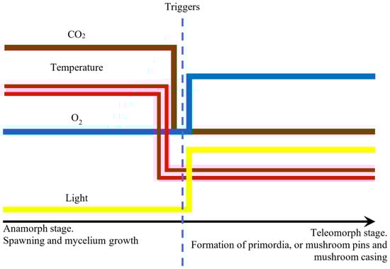 Preferential conditions for the production of a biomaterial with high mycelium density include a lack of light radiation, increased carbon dioxide concentration at a simultaneous reduced oxygen concentration, and elevated temperature (18–35 °C). Figure 10 presents parameters causing changes in the fungus development stage.